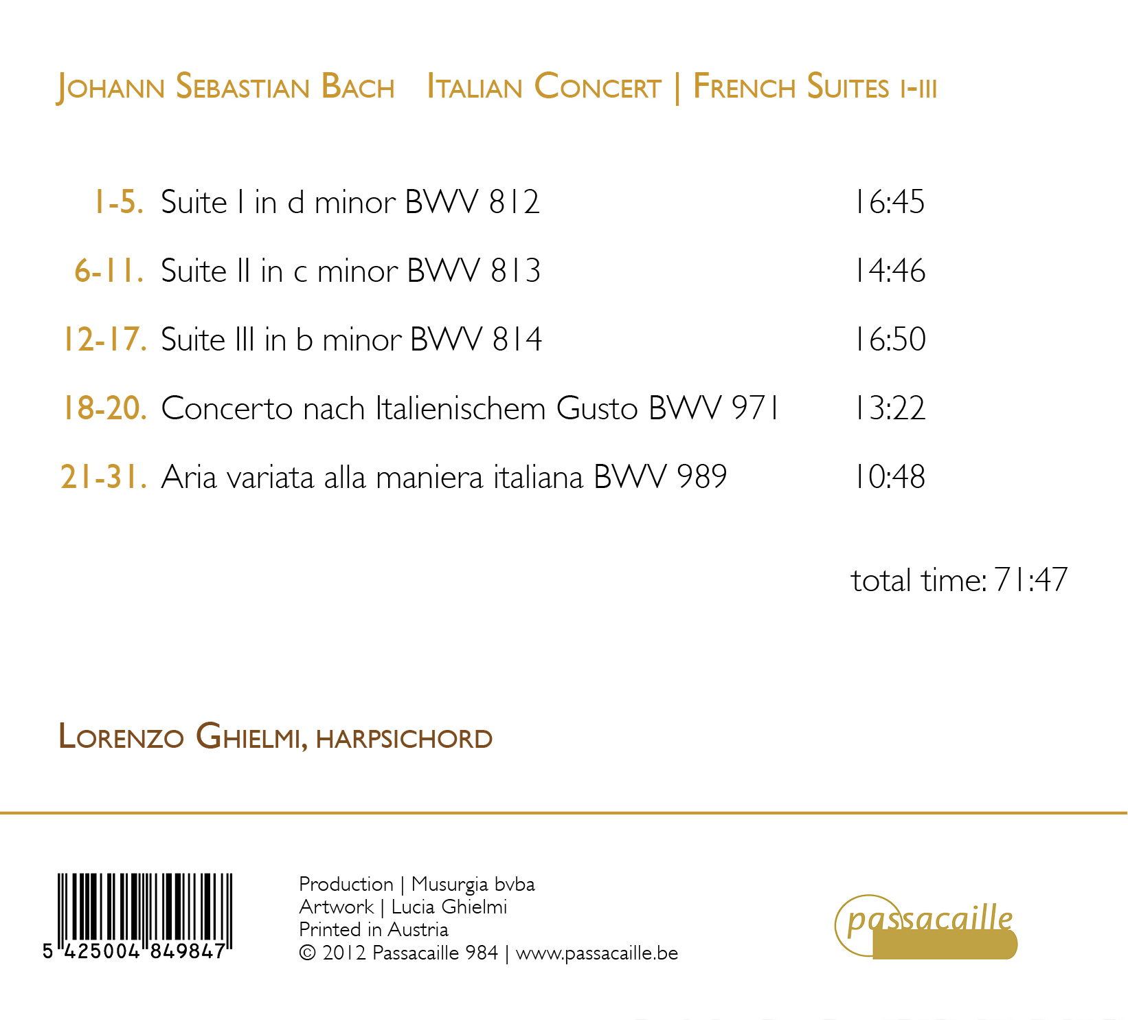 Confronting the two musical styles, French and Italian, in one recording, shows that the great Bach made a perfect synthesis of the best of both worlds in these masterpieces.