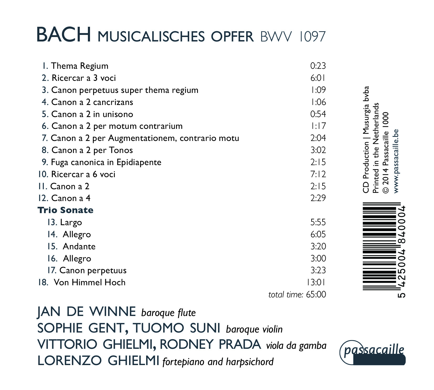 L’Offrande musicale de Bach : une œuvre pleine d’énigmes et de strates cachées qui trouve son origine dans une visite au roi de Prusse, joueur de flûte, en mai 1747. Cette œuvre a besoin d’interprètes solides, capables de surmonter toutes les difficultés et d’apporter la véritable expression de cette grande musique. Avec Sophie Gent, Jan De Winne, Lorenzo et Vittorio Ghielmi comme interprètes principaux, l’Offrande musicale de Bach sonne frais, profondément expressif et coloré. L’utilisation du pianoforte Silbermann pour certaines parties de la composition donne un aspect unique à la texture du son. L’enregistrement est complété par les variations canoniques sur Vom Himmel Hoch de Bach, une œuvre qu’il a composé la même année et qui respire le même style polyphonique ‘savant’.