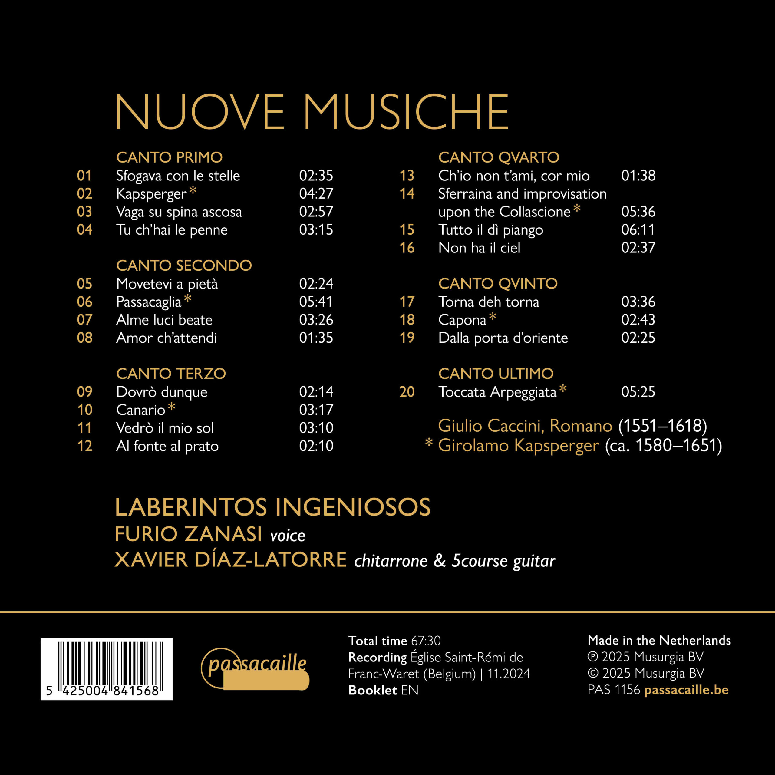 Dans Le Nuove Musiche, la voix d’une grande expressivité de Furio Zanasi et le jeu magistral du théorbe de Xavier Díaz-Latorre confèrent une profondeur nouvelle à la musique novatrice de Giulio Caccini et de Heinrich Kapsberger. L’esthétique radicale de Caccini — qui place l’intelligibilité du texte au centre, confie à la mélodie la charge du sens expressif et réduit l’accompagnement à un basso continuo à la fois discret et puissamment évocateur — s’y manifeste avec une clarté remarquable.