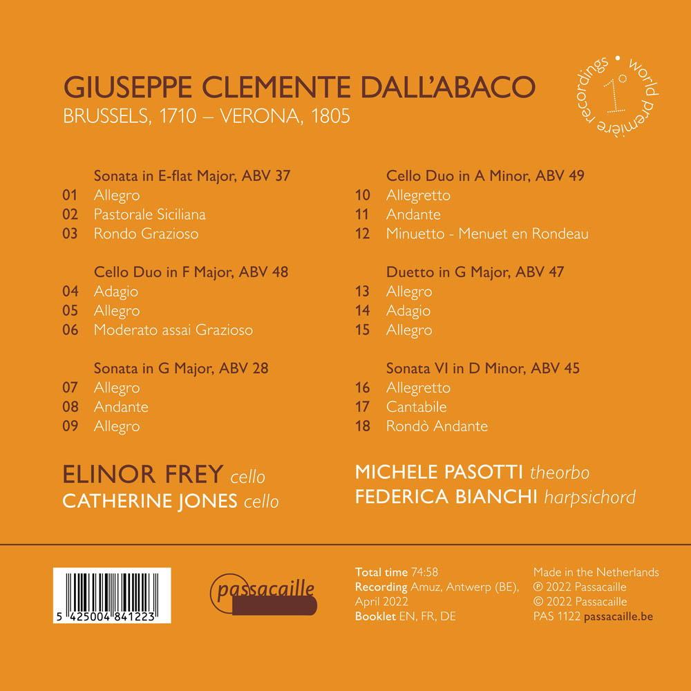 Fils d’un célèbre compositeur de Vérone, Giuseppe Clemente Dall’Abaco apprend à jouer du violoncelle lors de son enfance à Munich, à peu près à l’époque où Bach écrivait ses célèbres suites pour violoncelle. Quelques années plus tard, en 1729, Dall’Abaco trouve son premier emploi en tant que violoncelliste à Bonn, à la cour du prince-électeur de Cologne. C’est le début d’une carrière musicale fascinante qui le rend célèbre à Londres, Paris, Vienne, et dans d’autres centres musicaux européens. La grâce française, la logique allemande et la virtuosité italienne sont réunies dans les fines sonates et duos pour violoncelle de Giuseppe Clemente Dall’Abaco, un enregistrement en première mondiale d’œuvres qui offrent un éventail remarquable d’exigences techniques et de variété musicale.
