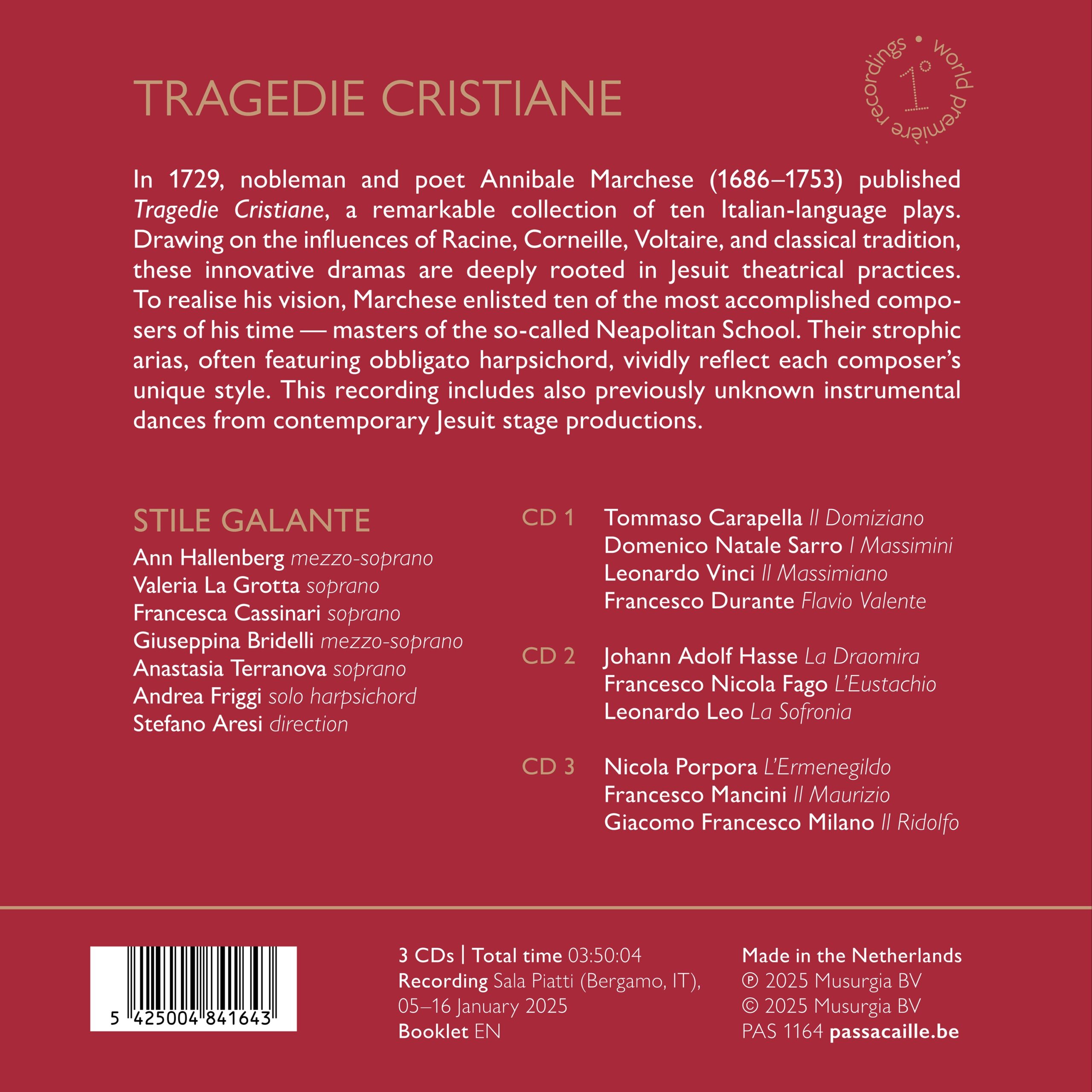 En 1729, le poète noble Annibale Marchese (1686–1753) publia Tragedie Cristiane, un recueil remarquable de dix pièces de théâtre en italien. Influencés par Racine, Corneille, Voltaire et la tradition classique, ces drames novateurs trouvent leurs racines profondes dans la pratique théâtrale jésuite. Pour réaliser sa vision, Marchese engagea dix des compositeurs les plus talentueux de son temps, maîtres de l’école dite napolitaine. Leurs airs strophiques, souvent accompagnés d’un clavecin obligé, reflètent le style unique de chaque compositeur. Cet enregistrement comprend également des danses instrumentales inédites issues de productions théâtrales jésuites de l’époque.