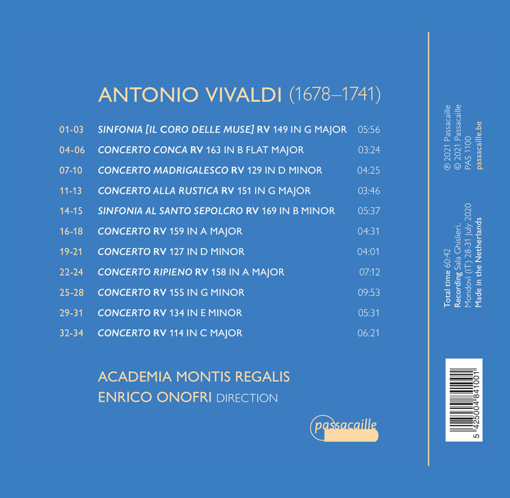 Les Concerti Ripieni de Vivaldi sont probablement les œuvres les plus inhabituelles écrites par le compositeur vénitien. Certaines de ces pièces sont toutefois particulièrement exceptionnelles pour diverses raisons, surtout si l’on considère l’environnement artistique de la Venise du début du XVIIIe siècle. Cet enregistrement présente les œuvres les plus brillantes et en même temps les plus bizarres de Vivaldi dans ce genre. Ces expériences compositionnelles sont parfois assez extrêmes et très en avance sur leur temps, comme l’énigmatique Concerto Conca, la solennelle Sinfonia Al Santo Sepolcro, l’avant-gardiste et en même temps archaïque Concerto Alla Rustica. Cet enregistrement est la première collaboration de l’Academia Montis Regalis avec Enrico Onofri comme chef principal.