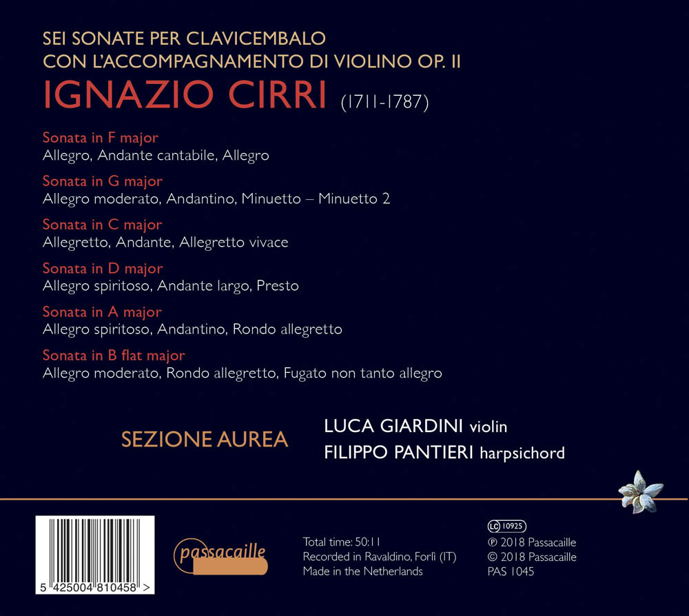 Ignazio Cirri was een geestelijke, koordirigent, organist en bescheiden provinciaal componist – hoewel gewaardeerd door Padre Martini, destijds een vooraanstaande muzikale autoriteit – die carrière maakte in zijn geboortestad Forli. Zijn werk, waarvan weinig gepubliceerd is, bestaat voornamelijk uit sonates: 12 voor orgel (op. 1) en de 6 opgenomen op dit album (op. 2).