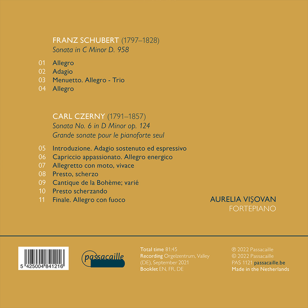 Franz Schubert en Carl Czerny – twee tijdgenoten, woonachtig in dezelfde stad, beiden op hun eigen manier nauw verbonden met Beethoven. De eerste klom op en wordt tegenwoordig beschouwd als een van de belangrijkste componisten uit de hele muziekgeschiedenis; de tweede, hoewel een zeer productief componist en een zeer geliefde leerling van Beethoven, bleef in de volksherinnering vooral over als leraar en schepper van talrijke studiewerken van weinig muzikale waarde. Zijn Grande Sonate in D mineur, verreweg de langste van zijn elf sonates, werd onmiddellijk na Beethovens dood geschreven en kan worden beschouwd als een poging om het domein van diens Hammerklavier Sonate te bereiken: met zijn zeven delen en spectaculaire technische uitdagingen is het werk een lang vergeten meesterwerk dat zijn plaats verdient tussen de grote oeuvres van de 19e eeuw. In deze opname presenteert Aurelia Vişovan het voor de allereerste keer aan het publiek op een fortepiano, naast Schuberts dramatische Sonate in C-klein, D. 958, gecomponeerd in hetzelfde jaar.