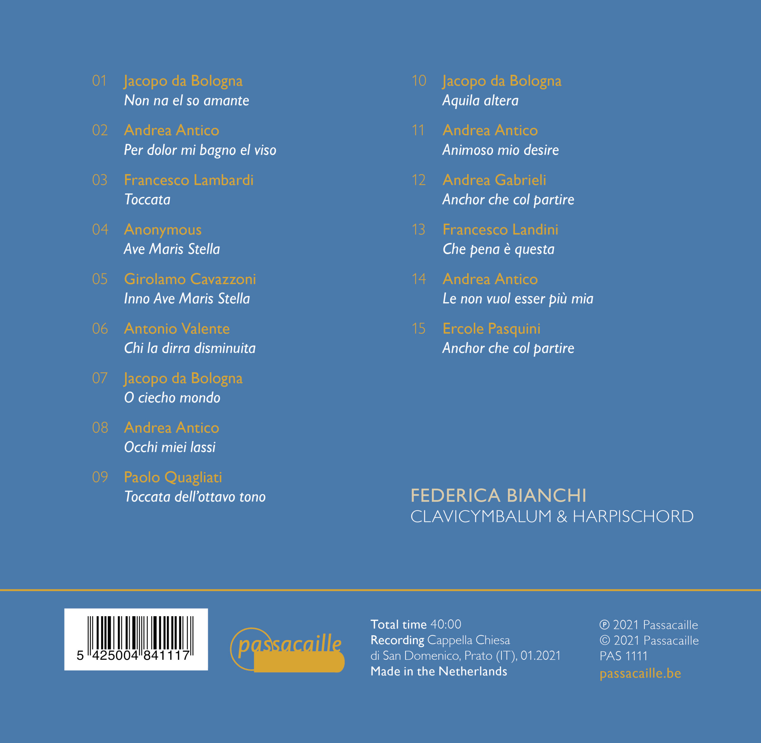 Met deze opname verkent Federica Bianchi de ontwikkeling van muziek voor klavierinstrumenten van het begin van de 15e eeuw tot het begin van de Barok. De vroegste werken zijn afkomstig uit de beroemde Codex Faenza (ca. 1400-1420), een manuscript met wereldlijke liederen gearrangeerd voor klavierinstrumenten door componisten als Jacopo da Bologna en Guillaume de Machaut. De vroegste gedrukte verzameling (1517), uitsluitend gewijd aan muziek voor klavierinstrumenten, is een andere mijlpaal in deze ontwikkeling. Latere werken op dit album omvatten bewerkingen van renaissancehits als Ancor che col partire. Federica Bianchi’s verkenning van dit repertoire voert haar naar de toccata’s van de late 16e en vroege 17e eeuw.