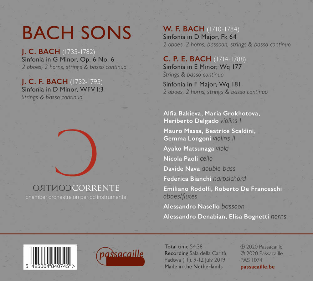 Een dynamisch nieuw Italiaans barokorkest debuteert met onconventionele symfonieën. Controcorrente koos vier van Bachs zonen, allen geboren tussen 1710 en 1735, en voert hun verkenning van het toen nieuwe genre uit tussen ca. 1755 en ca. 1770, toen de vijf Sinfonie die hier zijn opgenomen werden gecomponeerd.