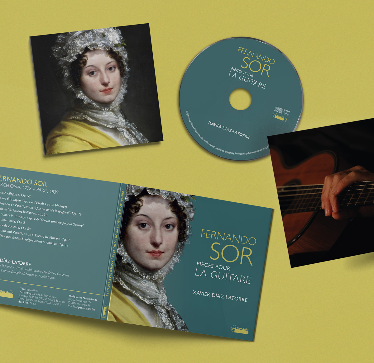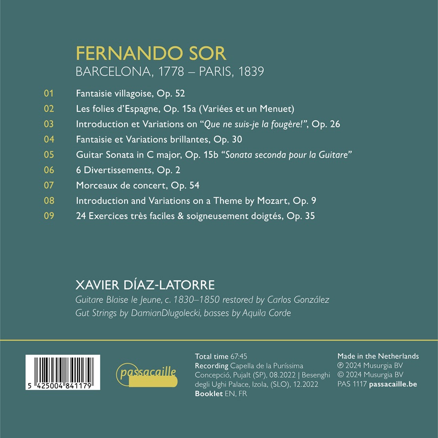 Fernando Sor, een unieke persoonlijkheid in de wereld van de klassieke gitaar, zorgde voor een revolutie in de gitaarcompositie door de rijke texturen van orkestmuziek te imiteren. Hij werd opgeleid aan de prestigieuze Escolania de Montserrat en kreeg les van pater Anselm Viola. Zijn werken weerspiegelen een diep begrip van contrapunt en polyfonie, die doet denken aan de invloed van Haydn. Zijn innovatieve technieken, van het gebruik van natuurlijke harmonischen tot polyfone texturen, transformeerden de gitaar in een instrument dat een spectrum aan orkestrale klanken kan produceren. Dit album met Xavier Díaz-Latorre bevat een aantal van Sor’s mooiste stukken, waaronder Les Folies d’Espagne, Op. 15 en Variations Brillantes sur un Air Favori de Mozart, Op. 9, die zijn compositorische genialiteit en de indrukwekkende kracht van zijn muziek laten horen. Elk nummer is een testament van Sor’s nalatenschap, combineert klassieke elegantie met expressieve diepte en biedt luisteraars een buitengewone luisterervaring.