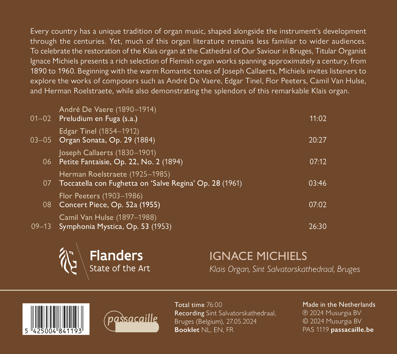 Every country has a unique tradition of organ music, shaped alongside the instrument’s development through the centuries. Yet, much of this organ literature remains less familiar to wider audiences. To celebrate the restoration of the Klais organ at the Cathedral of Our Saviour in Bruges, Titular Organist Ignace Michiels presents a rich selection of Flemish organ works spanning approximately a century, from 1884 to 1961. Beginning with the warm Romantic tones of Joseph Callaerts, Michiels invites listeners to explore the works of composers such as André De Vaere, Edgar Tinel, Flor Peeters, Camiel Van Hulse, and Herman Roelstraete, while also demonstrating the splendors of this remarkable Klais organ.