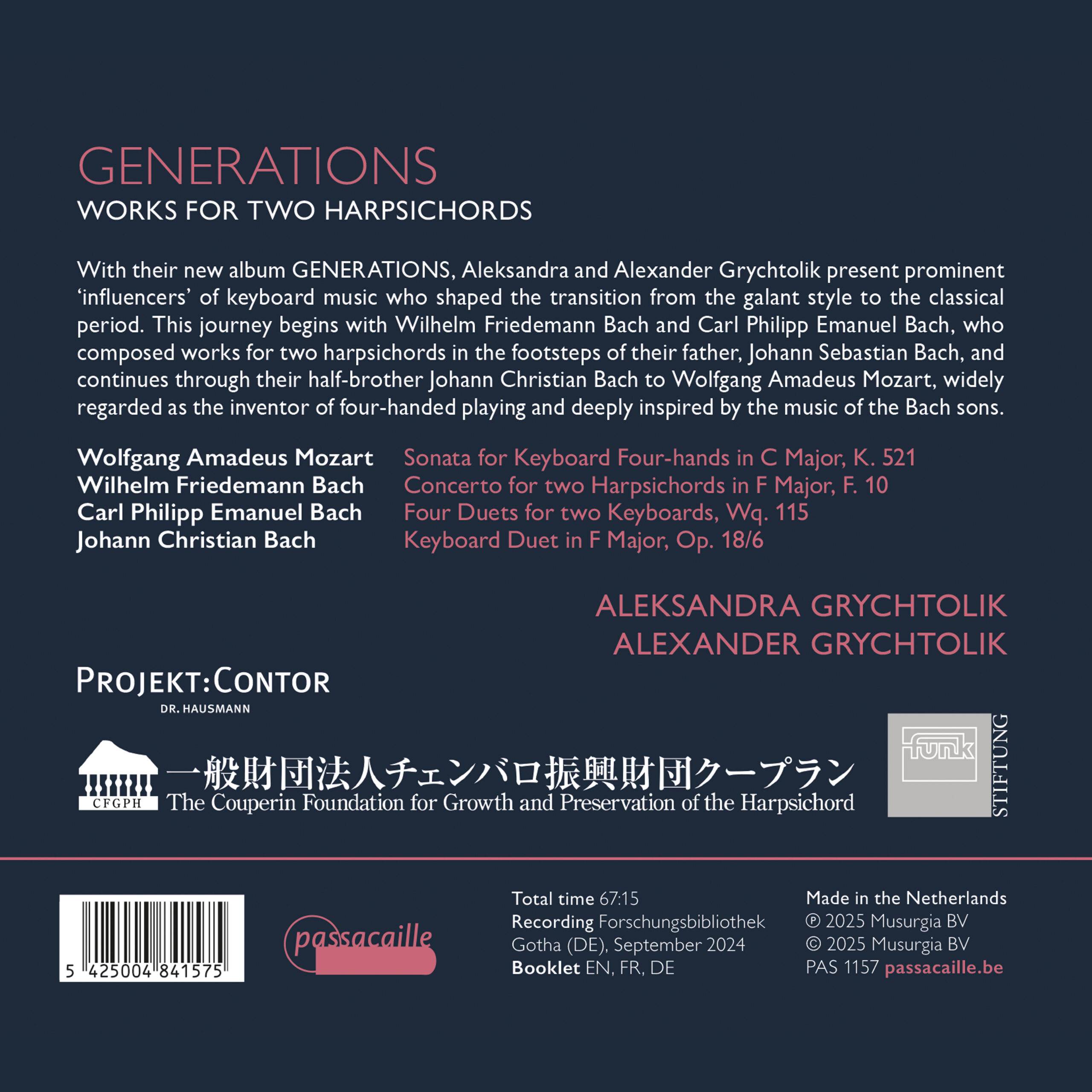 Met hun nieuwe album Generations presenteren Aleksandra en Alexander Grychtolik belangrijke ‘beïnvloeders’ van de klaviermuziek die de overgang van de galante stijl naar de klassieke periode vormgaven. Deze reis begint bij Wilhelm Friedemann Bach en Carl Philipp Emanuel Bach, die net als hun vader Johann Sebastian Bach werken voor twee klavecimbels componeerden, en gaat verder via hun halfbroer Johann Christian Bach naar Wolfgang Amadeus Mozart, die algemeen wordt beschouwd als de uitvinder van het vierhandig spelen en diep geïnspireerd was door de muziek van de Bach-zonen.