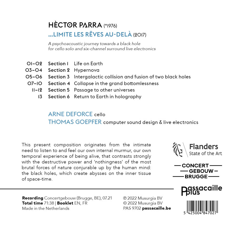 In dit uitgebreide werk voor cello en live elektronica ontwikkelt Hèctor Parra een psycho-akoestische reis naar de grenzen van de bekende wereld. We betreden een universum dat verder rijkt dan onze zintuiglijke ervaring, een soort “paradiso” dat we ons alleen maar kunnen voorstellen. Inspiratie voor dit stuk zijn de relativistische natuurkunde en de utopische reis door een reusachtig zwart gat zoals beschreven door de Franse natuurkundige Jean-Pierre Luminet.