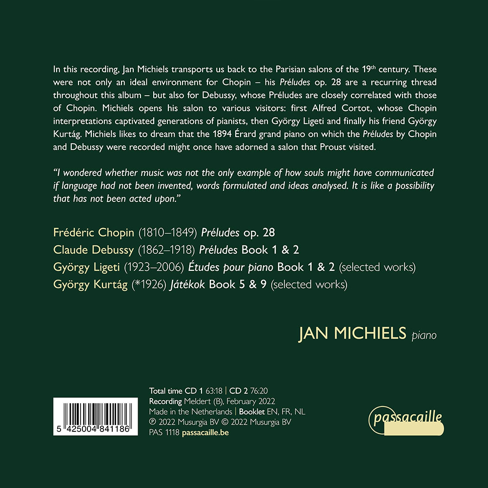 In deze opname voert Jan Michiels ons terug naar de Parijse salons van de 19e eeuw. Die waren niet alleen een ideale omgeving voor Chopin – zijn Préludes op. 28 vormen een rode draad doorheen dit album – maar ook voor Debussy, wiens Préludes nauw verwant zijn met die van Chopin. Michiels stelt zijn salon open voor verschillende bezoekers: eerst Alfred Cortot, wiens Chopin-interpretaties generaties pianisten in de ban hielden, dan György Ligeti en tenslotte zijn vriend György Kurtág. Michiels houdt ervan zich in te beelden dat de Érard vleugel uit 1894 waarop de Préludes van Chopin en Debussy werden opgenomen, ooit een salon zou hebben gesierd die Proust bezocht.