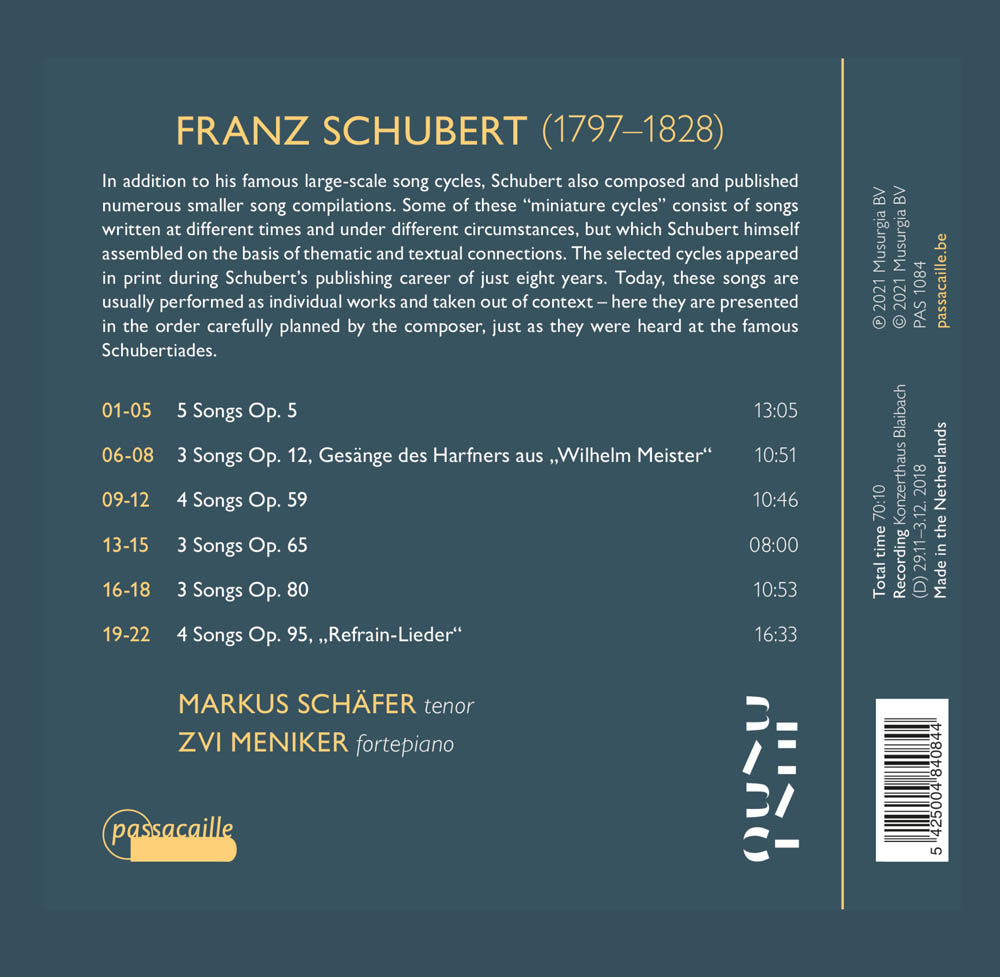 Naast zijn beroemde grootschalige liederencycli componeerde en publiceerde Schubert ook talrijke kleinere liedcompilaties. Sommige van deze “miniatuurcycli” bestaan uit liederen die op verschillende tijdstippen en onder verschillende omstandigheden zijn geschreven, maar die Schubert zelf heeft samengesteld op basis van thematische en tekstuele verbanden. De geselecteerde cycli verschenen in druk tijdens Schuberts publicatiecarrière van slechts acht jaar. Tegenwoordig worden deze liederen meestal uitgevoerd als afzonderlijke werken en uit hun verband gerukt – hier worden ze gepresenteerd in de volgorde die de componist zorgvuldig had gepland, precies zoals ze te horen waren op de beroemde Schubertiades.