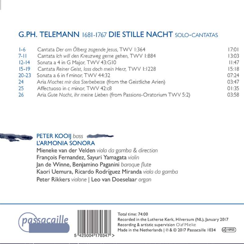 Begaafd: eerste opera – helaas verloren gegaan, net als de volgende – gecomponeerd op 12-jarige leeftijd. Productief: 1700 cantates, waarvan er slechts 1400 bewaard zijn gebleven. Hij kon alle in die tijd beschikbare instrumenten bespelen. De natuur gaf hem ook een prachtige bariton stem. Het is dan ook zeer waarschijnlijk dat Telemann de cantates voor basstem, waarvan deze opname ons een voorbeeld geeft, heeft gecomponeerd met als thema het lijdensverhaal van Christus.