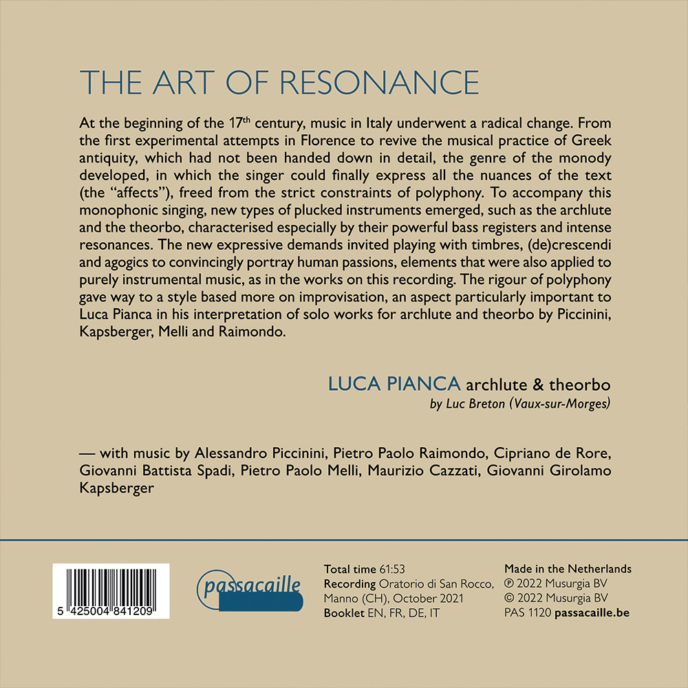 Aan het begin van de 17e eeuw onderging de muziek in Italië een radicale verandering. Vanaf de eerste experimentele pogingen in Florence om de muzikale praktijk van de Griekse oudheid, die niet in detail was overgeleverd, te doen herleven, ontwikkelde zich het genre van de monodie, waarin de zanger eindelijk alle nuances van de tekst (de “affecten”) kon uitdrukken, bevrijd van de strikte beperkingen van de polyfonie. Om deze monofone zang te begeleiden, ontstonden nieuwe soorten tokkelinstrumenten, zoals de aartsluit en de theorbe, die vooral werden gekenmerkt door hun krachtige basregisters en intense resonantie. De nieuwe expressieve eisen nodigden uit tot spelen met timbres, (de)crescendi en agogiek om menselijke passies overtuigend uit te beelden, elementen die ook werden toegepast op puur instrumentale muziek, zoals in de werken op deze opname. De strengheid van de polyfonie maakte plaats voor een stijl die meer op improvisatie was gebaseerd, een aspect dat voor Luca Pianca bijzonder belangrijk was in zijn interpretatie van solowerken voor aartsluit en theorbe van Piccinini, Kapsberger, Melli en Raimondo.