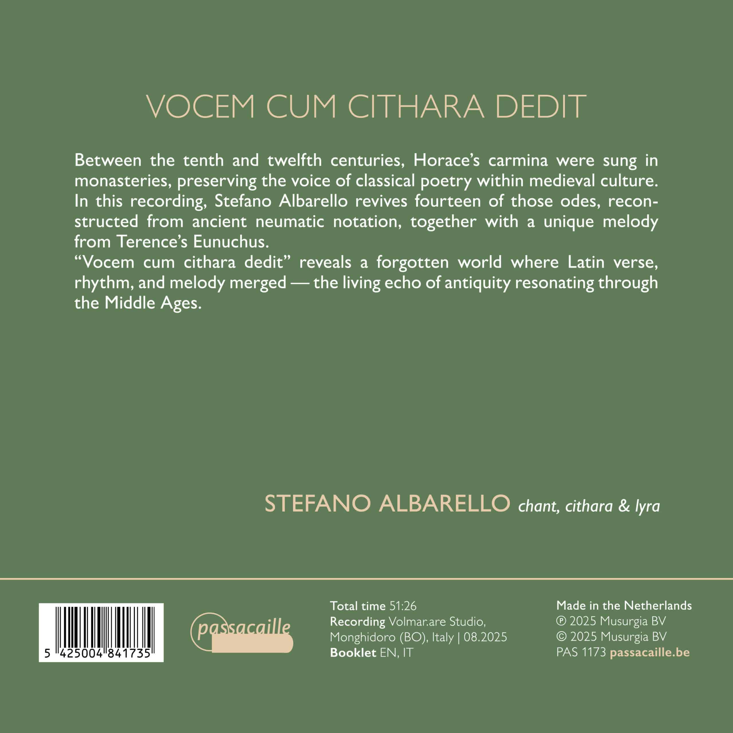 Dans cet enregistrement, Stefano Albarello ressuscite quatorze de ces odes, reconstruites à partir d’anciennes notations neumatiques, auxquelles s’ajoute une mélodie unique tirée de l’Eunuque de Térence.